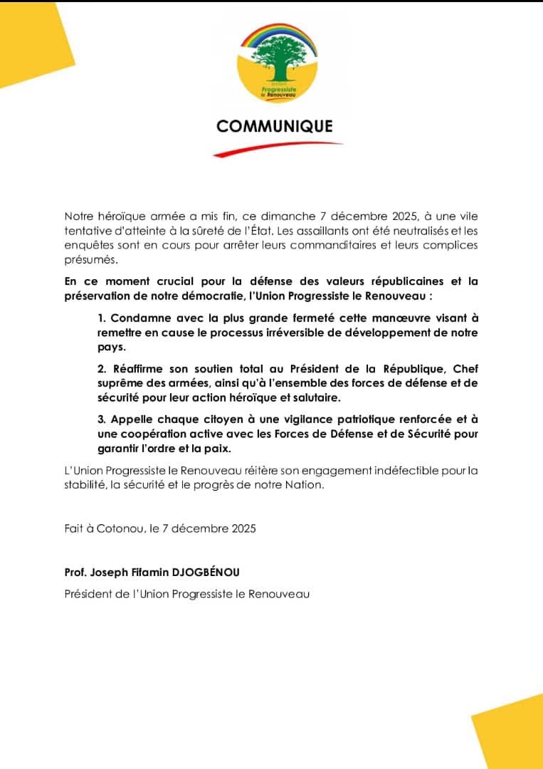 Le parti Union progressiste le renouveau (UP-R), a condamné la tentative de coup d'Etat survenue au Bénin dans la matinée de ce dimanche 07 décembre 2025. A travers un communiqué de presse, le parti a réaffirmé son « soutien total » au Président de la République et à l'ensemble des forces de défense et de sécurité.