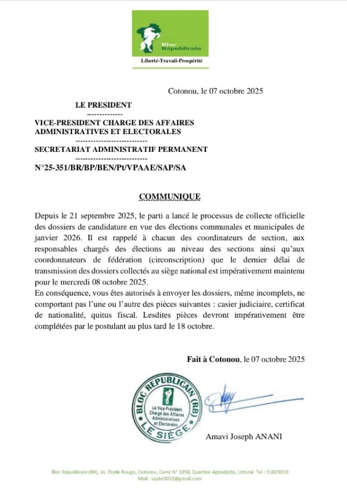 Dans un communiqué daté du 7 octobre 2025, signé par le vice-président chargé des affaires administratives et électorales, Amavi Joseph Anani, le parti Bloc Républicain (BR) rappelle à ses structures locales la rigueur du calendrier de dépôt des candidatures.