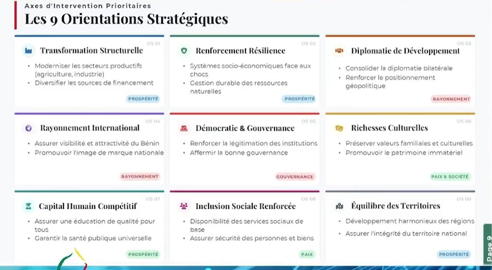 Présentant le contenu du document, le professeur Alastaire Séna Alinsato, président du comité technique de pilotage, a expliqué que la Vision repose sur « neuf (09) orientations stratégiques » et quatre (04) piliers : la paix, la bonne gouvernance, la prospérité et le rayonnement.