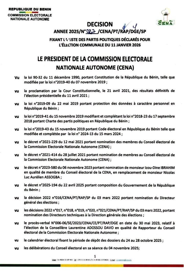 Par décision en date du 4 novembre 2025, le président de la CENA a publié la liste des partis politiques déclarés pour les élections communales du 11 janvier 2026.