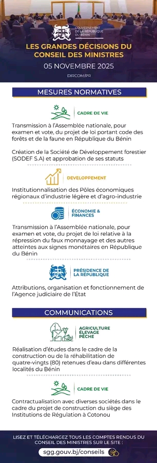 Le Conseil des ministres s'est réuni ce mercredi 5 novembre 2025, sous la présidence du Chef de l'Etat, Patrice Talon. Plusieurs grandes décisions ont été prises au cours de cette séance hebdomadaire.
